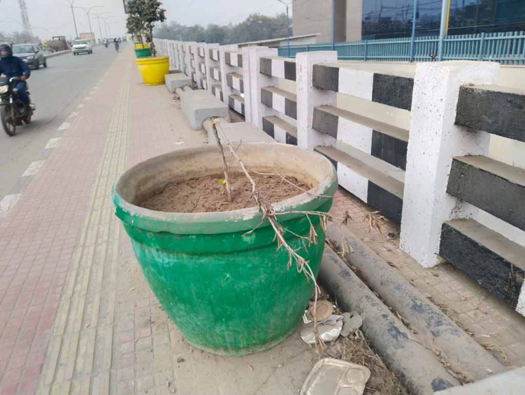 Faridabad/Alive News: एफएमडीए (महानगर विकास प्रधिकरण) ने शहर को सुंदर बढ़ाने के लिए लाखों रुपये खर्च कर नीलम रेलवे फ्लाईओवर पर पौधों के बढ़े-बढ़े गमले रखवाए थे, लेकिन इनका ध्यान रखना भुल गए जिस कारण अब गमले टूट गए है और उनमे लगे पौधे सुख गए है।