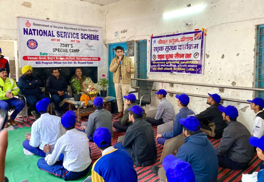 Faridabad/Alive News: ओल्ड फरीदाबाद स्थित राजकीय बाल विद्यालय में राष्ट्रीय सेवा योजना (एनएसएस) के साप्ताहिक कैंप के दौरान सड़क सुरक्षा, साइबर ठगी से बचाव और नशा मुक्ति को लेकर जागरूकता कार्यक्रम आयोजित किया गया। यह कार्यक्रम जिला उपायुक्त आयुष सिन्हा आईएएस के आदेश पर, प्रादेशिक परिवहन प्राधिकरण फरीदाबाद, फरीदाबाद पुलिस और स्टेट रोड सेफ्टी काउंसिल हरियाणा के सहयोग से आयोजित हुआ।