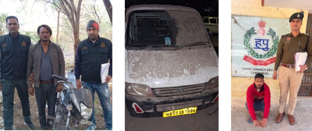 वहीं आरोपी अनिल कुमार, अनिल व अनिल भूषण को थाना सेक्टर 58 के एक चोरी के मामले में नीमका जेल से पुलिस प्रोडेक्शन पर लिया गया, इन से एक ईको गाडी बरामद की है।