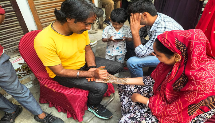 “कल से ही महिलाएं मेहंदी लगवाने आ रही हैं। आज तो लाइनें इतनी लंबी है कि रात तक काम करना पड़ेगा। सभी हाथों पर करवा चौथ से जुड़ी खास डिज़ाइन्स की मांग है।”