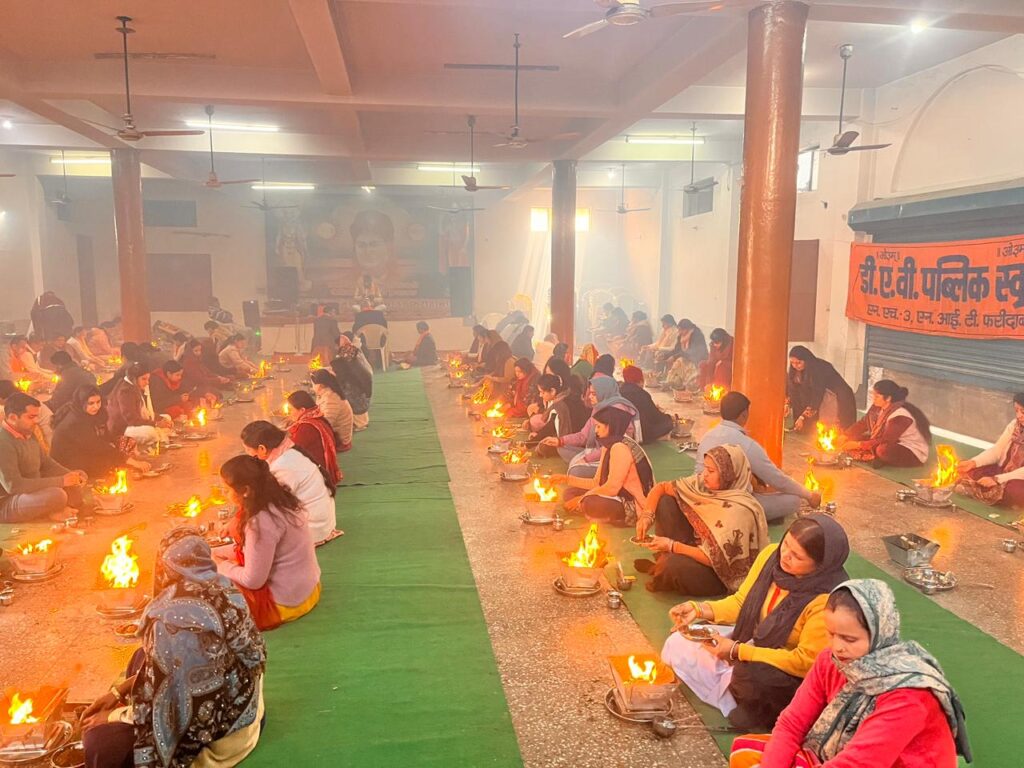 Faridabad/Alive News: डीएवी पब्लिक स्कूल एनएच-3 की ओर से 14 जनवरी 2026 को आर्य समाज मंदिर परिसर में सौ कुंडीय हवन का भव्य आयोजन किया गया। कार्यक्रम धार्मिक और आध्यात्मिक माहौल में संपन्न हुआ, जिसमें स्कूल के सभी स्टाफ सदस्य और आसपास के क्षेत्रों से बड़ी संख्या में श्रद्धालु शामिल हुए।