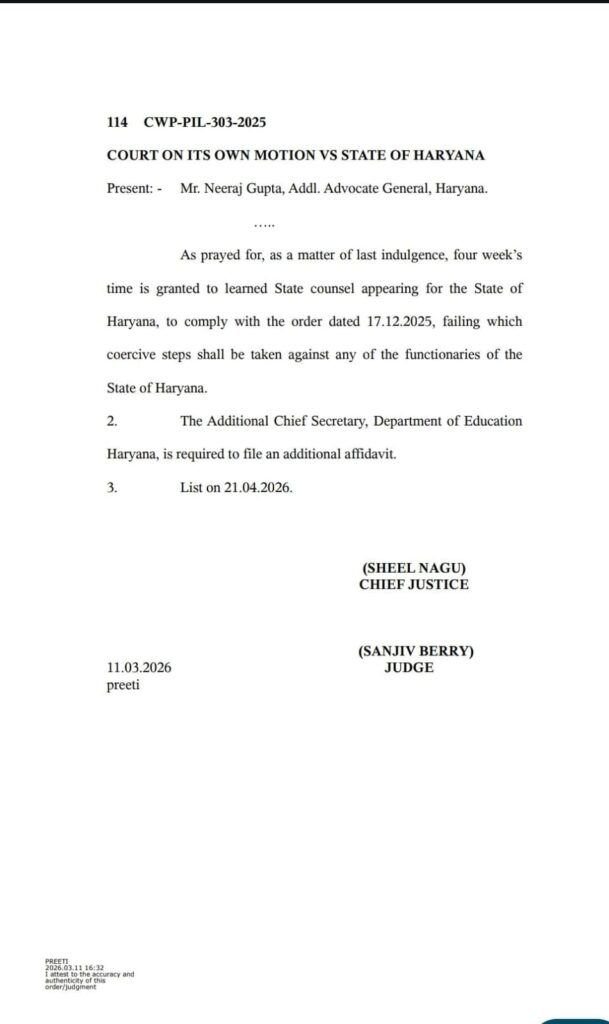 चीफ जस्टिस शील नागू की अध्यक्षता वाली खंडपीठ ने स्कूल शिक्षा विभाग के अतिरिक्त मुख्य सचिव को निर्देश दिया है कि वे 21 अप्रैल तक इस मामले में विस्तृत हलफनामा दाखिल करें। अदालत ने चेतावनी दी है कि यदि तय समय तक जवाब दाखिल नहीं किया गया तो सख्त कार्रवाई की जा सकती है।