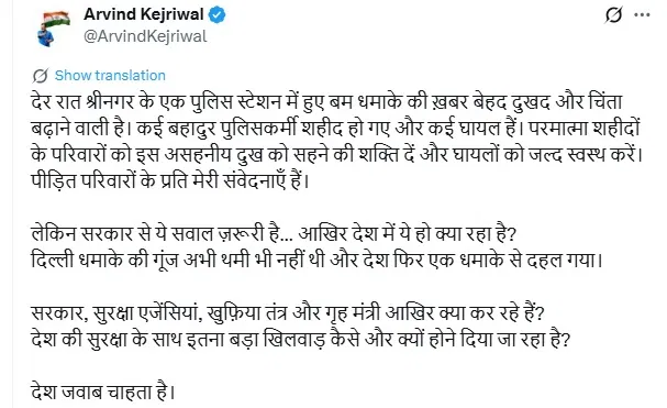 अरविंद केजरीवाल ने सोशल मीडिया प्लेटफॉर्म एक्स पर लिखा, ‘देर रात श्रीनगर के एक पुलिस स्टेशन में हुए बम धमाके की ख़बर बेहद दुखद और चिंता बढ़ाने वाली है। कई बहादुर पुलिसकर्मी शहीद हो गए और कई घायल हैं। परमात्मा शहीदों के परिवारों को इस असहनीय दुख को सहने की शक्ति दें और घायलों को जल्द स्वस्थ करें। पीड़ित परिवारों के प्रति मेरी संवेदनाएं हैं। लेकिन सरकार से ये सवाल जरूरी है…आखिर देश में ये हो क्या रहा है? दिल्ली धमाके की गूंज अभी थमी भी नहीं थी और देश फिर एक धमाके से दहल गया। सरकार, सुरक्षा एजेंसियां, खुफिया तंत्र और गृह मंत्री आखिर क्या कर रहे हैं? देश की सुरक्षा के साथ इतना बड़ा खिलवाड़ कैसे और क्यों होने दिया जा रहा है? देश जवाब चाहता है।’