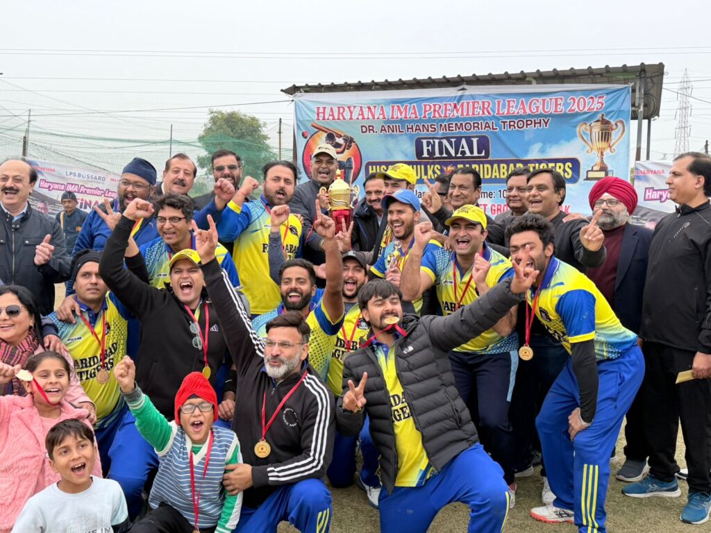 Faridabad/Alive News: रोहतक में आयोजित आईएमए हरियाणा क्रिकेट लीग के फाइनल मुकाबले में फरीदाबाद टाइगर्स ने हिसार हल्क्स को बेहद रोमांचक मैच में मात्र एक रन से हरा दिया। मुकाबला आखिरी गेंद तक चला और दर्शकों की सांसें थमी रहीं।