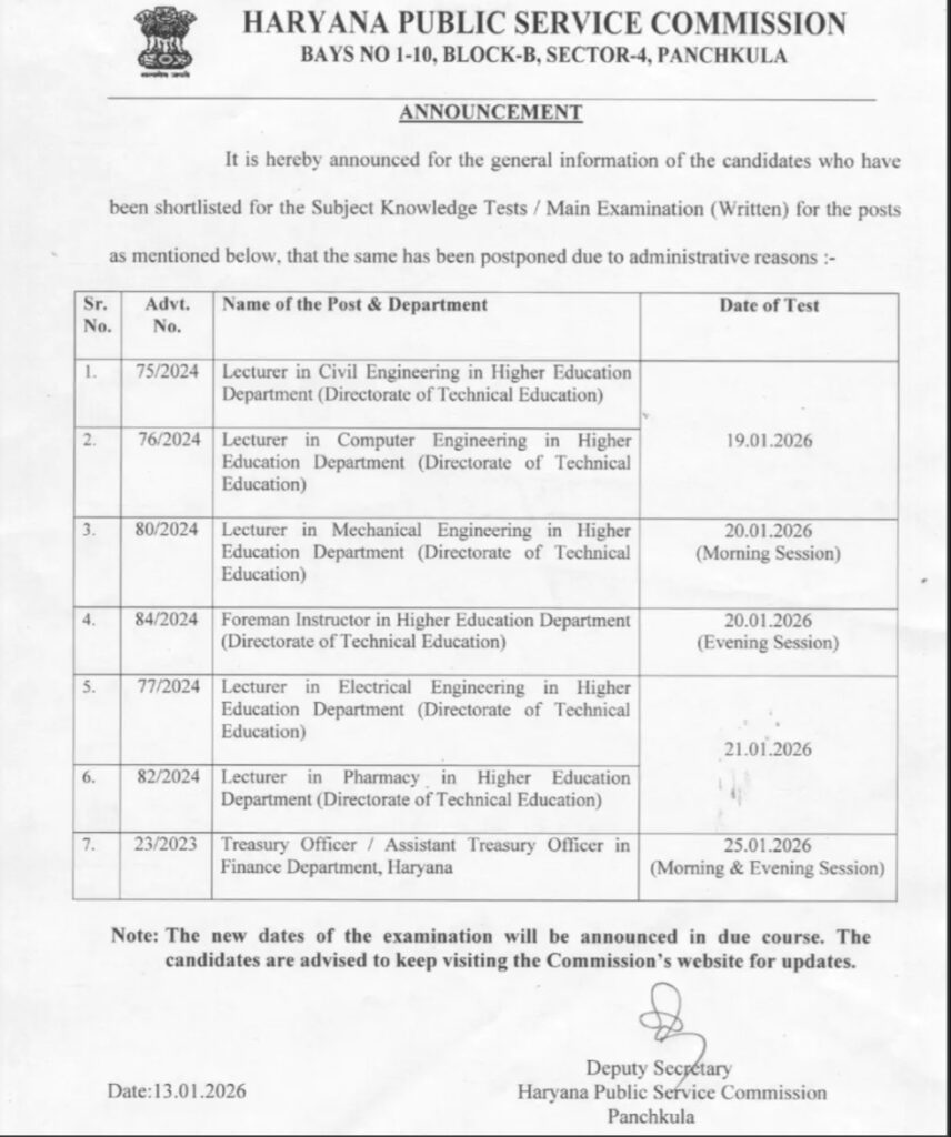Panchkula/Alive News: हरियाणा लोक सेवा आयोग (HPSC) ने जनवरी महीने में होने वाली 7 बड़ी भर्ती परीक्षाओं को स्थगित कर दिया है। ये परीक्षाएं 19 से 25 जनवरी के बीच आयोजित होनी थीं। आयोग ने इस संबंध में नोटिस जारी कर दिया है, लेकिन परीक्षाएं टालने का कोई स्पष्ट कारण नहीं बताया गया है। साथ ही, नई परीक्षा तिथियों को लेकर भी अभी कोई जानकारी नहीं दी गई है।