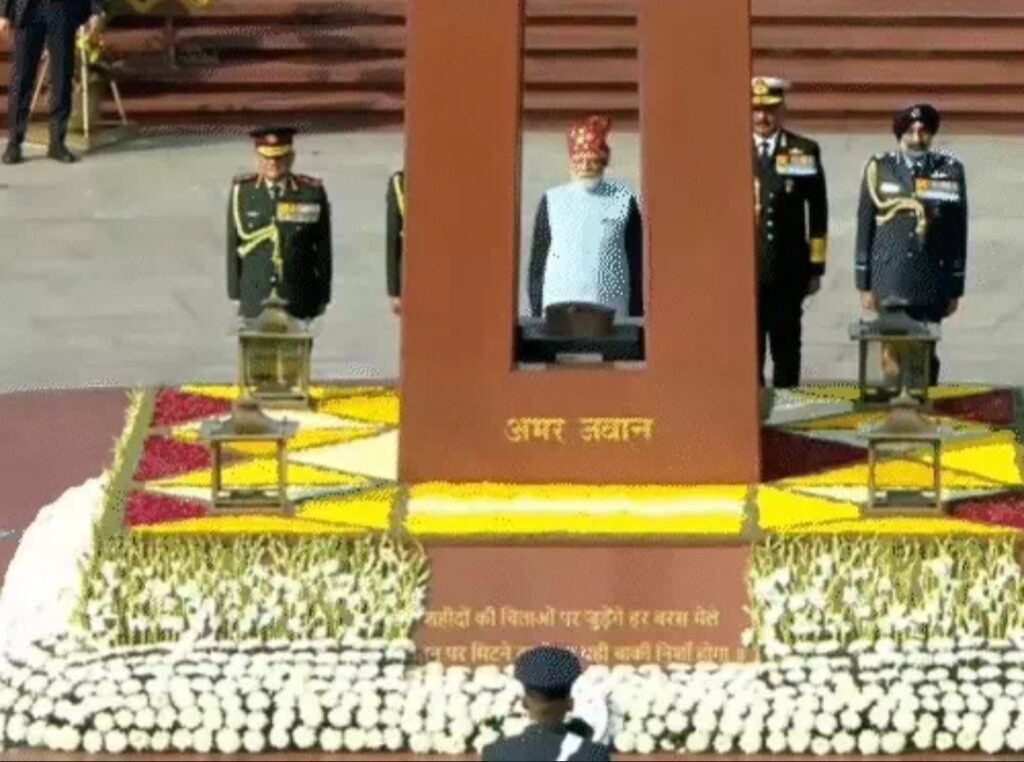 New Delhi/Alive News: देश आज अपना 77वां गणतंत्र दिवस पूरे गर्व और उत्साह के साथ मना रहा है। दिल्ली के कर्तव्य पथ पर गणतंत्र दिवस की भव्य परेड जारी है। समारोह की शुरुआत प्रधानमंत्री नरेंद्र मोदी द्वारा नेशनल वॉर मेमोरियल पर शहीदों को श्रद्धांजलि देने से हुई। उन्होंने दो मिनट का मौन रखकर वीरों को नमन किया।