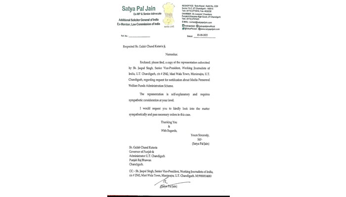 Chandigarh/Alive News : मान्यता प्राप्त पत्रकारों को पेंशन और अन्य सुविधाएं देने की मांग को एडिशनल सॉलिसिटर जनरल ऑफ इंडिया एवं चंडीगढ़ के पूर्व सांसद सत्यपाल जैन ने समर्थन दिया है। वर्किंग जर्नलिस्ट ऑफ इंडिया (डब्ल्यूजेआई), चंडीगढ़ के वरिष्ठ उपाध्यक्ष जसपाल सिंह ने गृहमंत्री अमित शाह और चंडीगढ़ प्रशासन को पत्र लिखकर पंजाब और हरियाणा की तरह चंडीगढ़ के पत्रकारों को भी 60 साल की उम्र के बाद पेंशन देने की मांग की है। सत्यपाल जैन ने इस मांग का समर्थन करते हुए चंडीगढ़ प्रशासन को पत्र भेजा और आग्रह किया कि इस पर सहानुभूतिपूर्वक विचार किया जाए। उन्होंने कहा कि यह कदम चंडीगढ़ के पत्रकारों के हित में होगा।