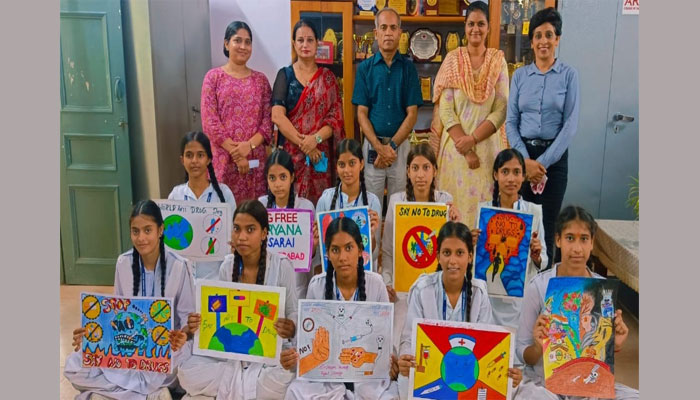 अतः हम सभी को भी देश एवं समाज को ड्रग्स रूपी बुराई से पार पाना होगा। प्राचार्य मनचंदा ने कहा कि देश से ड्रग्स तथा नशा समाप्त करने का उद्देश्य लोगों को ड्रग्स एडिक्शन की बुरी आदत से छुटकारा दिलाना तथा शारीरिक और मानसिक दुष्प्रभाव से बचाना है। पोस्टर मेकिंग और पेटिंग प्रतियोगिता में अध्यापिका सोनिया जैन, सरिता, दीपांजलि, सुशीला, ममता एवं गीता का विशेष सहयोग रहा।विद्यार्थियों ने बहुत ही आकर्षक पेटिंग्स और पोस्टर द्वारा ड्रग्स के हानिकारक प्रभावों से सचेत किया। प्राचार्य मनचंदा ने इन दोनों प्रतियोगिताओं में शालू और शिवानी को प्रथम, भूमी और मुस्कान को द्वितीय और ओमवती और साधना को तृतीय रहने पर सम्मानित किया गया। इस अवसर पर सभी सहयोगी अध्यापक उपस्थित रहे।