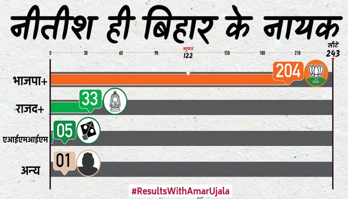बिहार विधानसभा चुनाव के अंतिम नतीजे शुक्रवार को चुनाव आयोग ने जारी कर दिए। इस बार भी सत्ता पर काबिज एनडीए ने शानदार जीत दर्ज की है। गठबंधन की सबसे बड़ी पार्टी भारतीय जनता पार्टी ने सबसे ज्यादा सीटें जीतीं, जबकि उसके सहयोगी जदयू दूसरे नंबर पर रही।