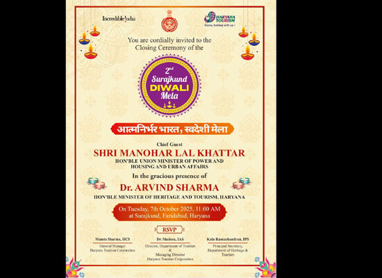 Faridabad/Alive News: हरियाणा पर्यटन निगम द्वारा आयोजित द्वितीय सूरजकुंड दिवाली मेला का समापन समारोह आगामी 7 अक्टूबर 2025 को प्रातः11 बजे सूरजकुंड में भव्य रूप से आयोजित किया जाएगा। इस अवसर पर कार्यक्रम के मुख्य अतिथि मनोहर लाल, माननीय केंद्रीय विद्युत एवं आवास तथा शहरी कार्य मंत्री, भारत सरकार होंगे। कार्यक्रम की अध्यक्षता हरियाणा के पर्यटन एवं धरोहर मंत्री डॉ. अरविन्द शर्मा […]