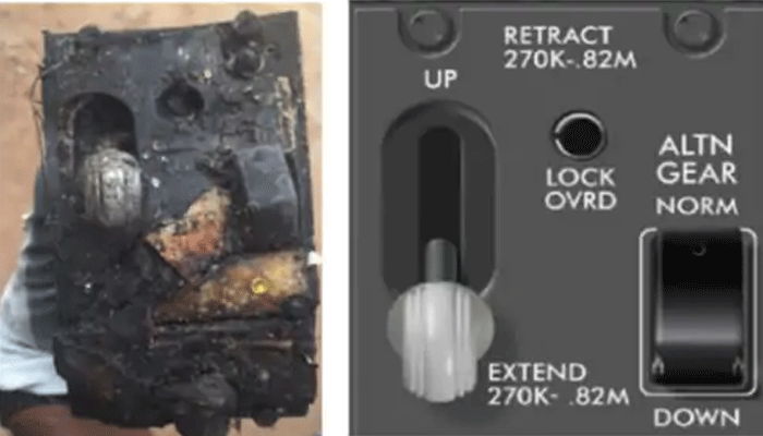 तस्वीर में बाईं तरफ एअर इंडिया की फ्लाइट का फ्यूल कंट्रोल स्विच है, जो क्रैश साइट पर मिला था। फ्यूल कंट्रोल स्विच विमान के कॉकपिट में थ्रस्ट लीवर के पास होते हैं।