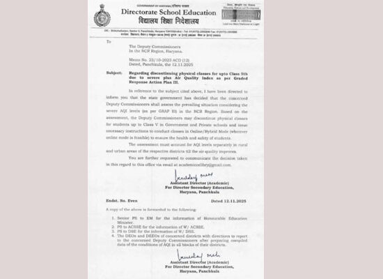 हरियाणा में 5वीं तक के स्कूल बंद करने के आदेश: बढ़ते प्रदूषण पर शिक्षा निदेशालय ने सभी उपायुक्तोंको को दिए अधिकार
