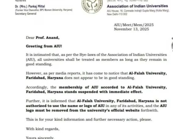 Faridabad/Alive News: हाल ही में सुर्खियों में आई अल-फलाह यूनिवर्सिटी पर अब बड़ी कार्रवाई हुई है। एसोसिएशन ऑफ इंडियन यूनिवर्सिटीज़ (AIU) ने यूनिवर्सिटी की सदस्यता तत्काल प्रभाव से रद्द कर दी है। वहीं, यूनिवर्सिटी प्रशासन ने अपनी आधिकारिक वेबसाइट को बंद कर दिया है। एआईयू ने अपने बयान में कहा कि संस्था के उपनियमों के […]