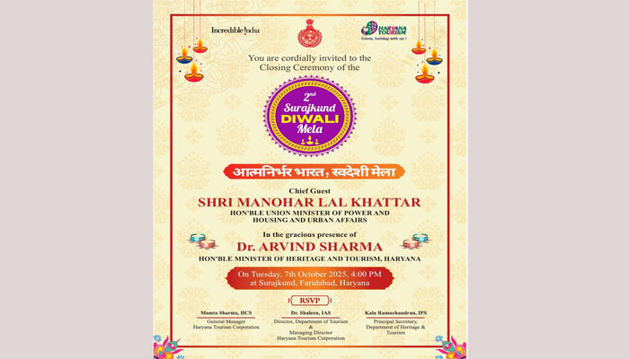Faridabad/Alive News: हरियाणा पर्यटन निगम द्वारा आयोजित किया जा रहा द्वितीय सूरजकुंड दीपावली मेले का मंगलवार 7 अक्टूबर को दोपहर बाद चार बजे भव्य समापन समारोह के साथ समापन होगा। समापन समारोह में केंद्रीय विद्युत एवं आवास तथा शहरी कार्य मंत्री मनोहर लाल मुख्य अतिथि होंगे।