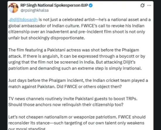 Delhi/Alive News: फिल्म सरदार जी-3 में पाकिस्तानी एक्ट्रेस हानिया आमिर के साथ काम करने पर एक्टर दिलजीत दोसांझ विवादों में आ गए हैं। कुछ लोगों ने उनकी आलोचना की और FWICE (फेडरेशन ऑफ वेस्टर्न इंडिया सिने एम्प्लॉइज) ने तो उनकी भारतीय नागरिकता रद्द करने की मांग भी कर दी। इस पर अब बीजेपी के राष्ट्रीय […]
