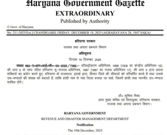 हरियाणा में 23वां जिला बना हांसी, नोटिफिकेशन जारी; हिसार की सीमाएं बदलीं