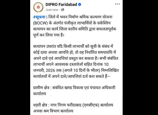 Faridabad/Alive News: जिले में भवन निर्माण श्रमिक कल्याण योजना के अंतर्गत पंजीकृत लाभार्थियों के वर्क स्लिप सत्यापन का कार्य जिला स्तरीय समिति ने सफलतापूर्वक पूर्ण कर लिया है। यह जानकारी उप-मंडल अधिकारी अमित कुमार ने दी। एसडीएम अमित कुमार ने सूचित किया है कि हाल ही में किए गए लाभार्थियों के सत्यापन के उपरांत यदि किसी […]