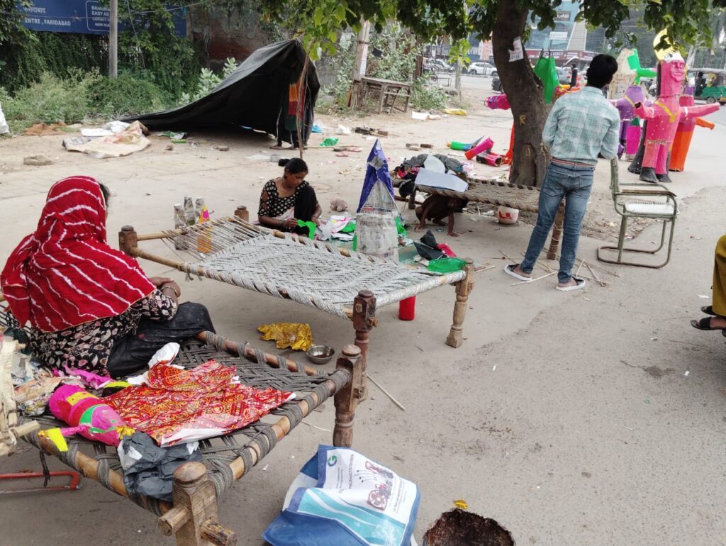Faridabad/Alive News: दशहरे पर जलाए जाने वाले रावण, मेघनाथ और कुंभकरण के पुतले बनाने वाले कारीगरों की मेहनत इस बार बारिश ने धो डाली। कन्नौज से आए सुनील पिछले पांच साल से अपने परिवार के साथ फरीदाबाद के नीलम चौक पर आकर पुतले बनाते हैं और बेचते हैं। उनका कहना था कि इस बार बारिश ने उनकी सारी मेहनत पर पानी फेर दिया।