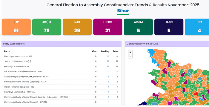 Bihar/Alive News: बिहार विधानसभा चुनाव के रुझानों में एनडीए बंपर जीत की तरफ बढ़ रहा है। राजद के नेतृत्व में महागठबंधन का बुरा हाल है। साफ है कि बिहार की जनता ने पीएम मोदी और नीतीश कुमार के नेतृत्व में एक बार फिर विश्वास जताया है।