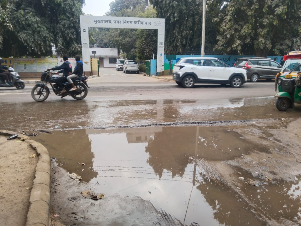 Faridabad/Alive News: फरीदाबाद शहर के विकास और सफाई व्यवस्था की जिम्मेदारी संभालने वाला नगर निगम इन दिनों खुद अव्यवस्थाओं का शिकार हो रहा है। बीके चौक स्थित नगर निगम मुख्यालय के ठीक सामने कई दिनों से सीवर का गंदा पानी भरा रहा है और इसकी वजह से सामने की सड़क गड्ढे में बदल गई है। लेकिन संबंधित अधिकारी इस समस्या की सुध लेने को तैयार नहीं हैं।