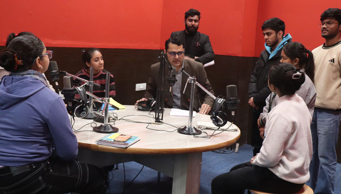 On Wednesday, during the internship ongoing at the Media Department Studio, Head of Department Prof. Pawan Singh welcomed PR and Advertising expert Bhupendra by presenting him with a sapling. In his address, Prof. Pawan Singh stated that through this workshop, students would become familiar with the genre of voice-over and learn the fine details of PR and advertising alongside voice expertise. He emphasized that media students can carve out a distinct identity for themselves solely on the strength of an idea.